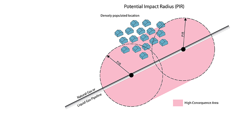 The extent of the Potential Impact Radius (PIR) from the pipeline depends on the contents and pressure within pipeline. If the PIR contains a densely populated area or other designated feature such as a school, then an HCA is established, as shown in shaded area.