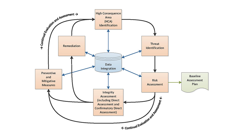 This flowchart illustrates the many inter-related aspects involved with Integrity Management. Source: Page 7 of the Integrity Management of Gas Transmission Pipelines in High Consequence Areas.